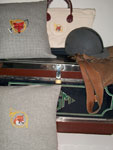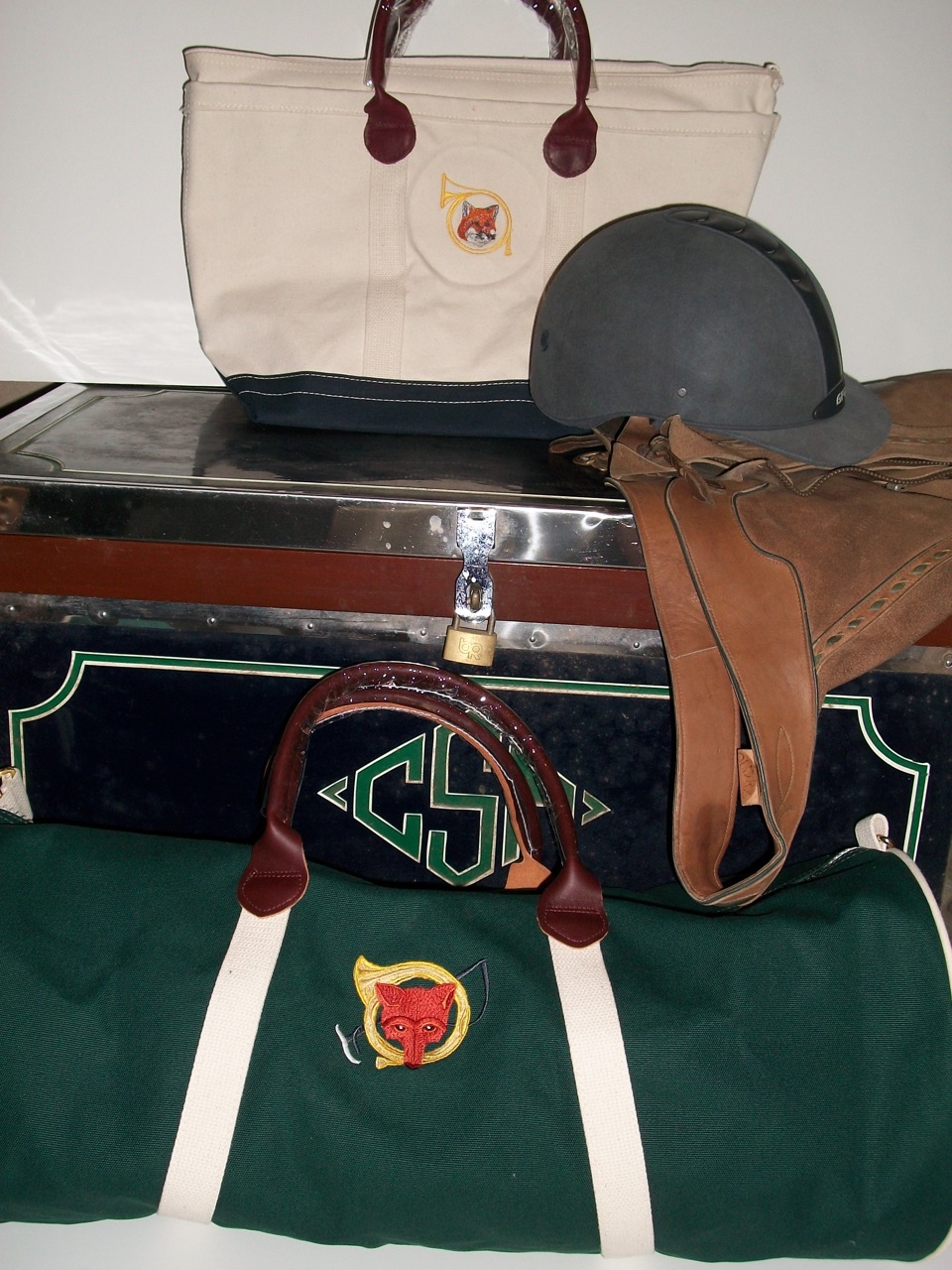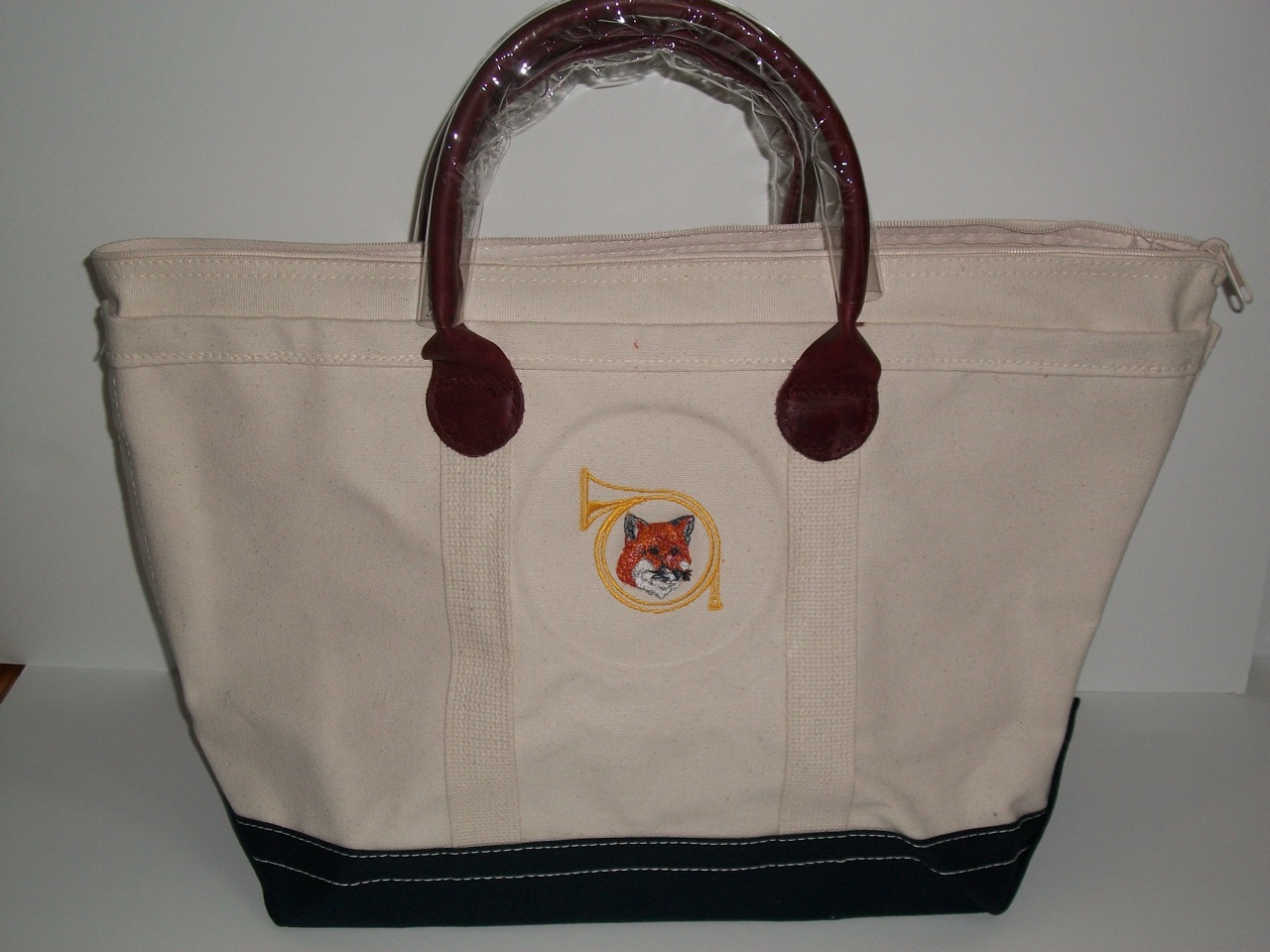 CUSTOM MADE 22 OZ TOTE/COAL BAGS WITH EQUESTRIAN BUCK-LEATHER HANDLES..plus special inside 5/5" zippered pocket and 2" zippered top. |