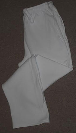 NEW White 7 OZ. Cotton/Fleece (80%cotton/20%Poly) Classic Full Cut/Straight Leg/Longer Rise "Sweatpant" , Open Hemmed Bottom That Finishes at a 31" Inseam On A Size Med., Elastic Waist With Inside Drawstring & Two Large On-Seam Side Pockets, 100% Wash/Wear. Sizes: S-XXL; |