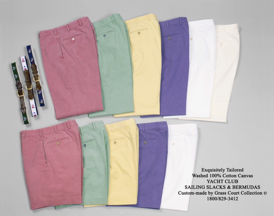 In vintage Nantucket Red, Light Yellow, Sea Green, Winter White, Bone Cream, Navy, Lavender & Cape Cod Pink. Full straight leg/longer rise fit & exquisitely tailored. All trousers/Bermudas come plain front only. Bermudas finished/hemmed at 20" and slacks unfinished at 37". Sizes: 34 - 42
